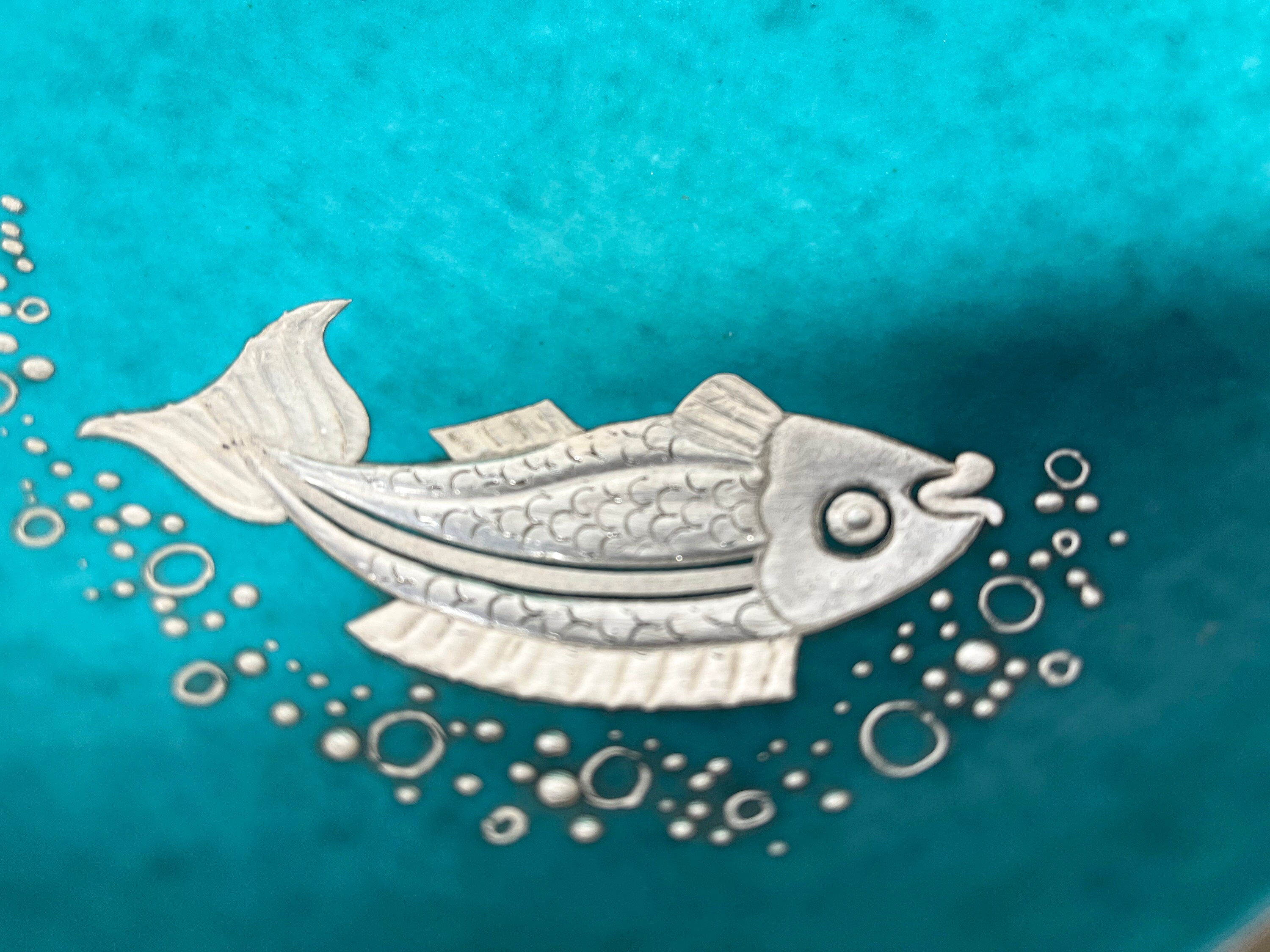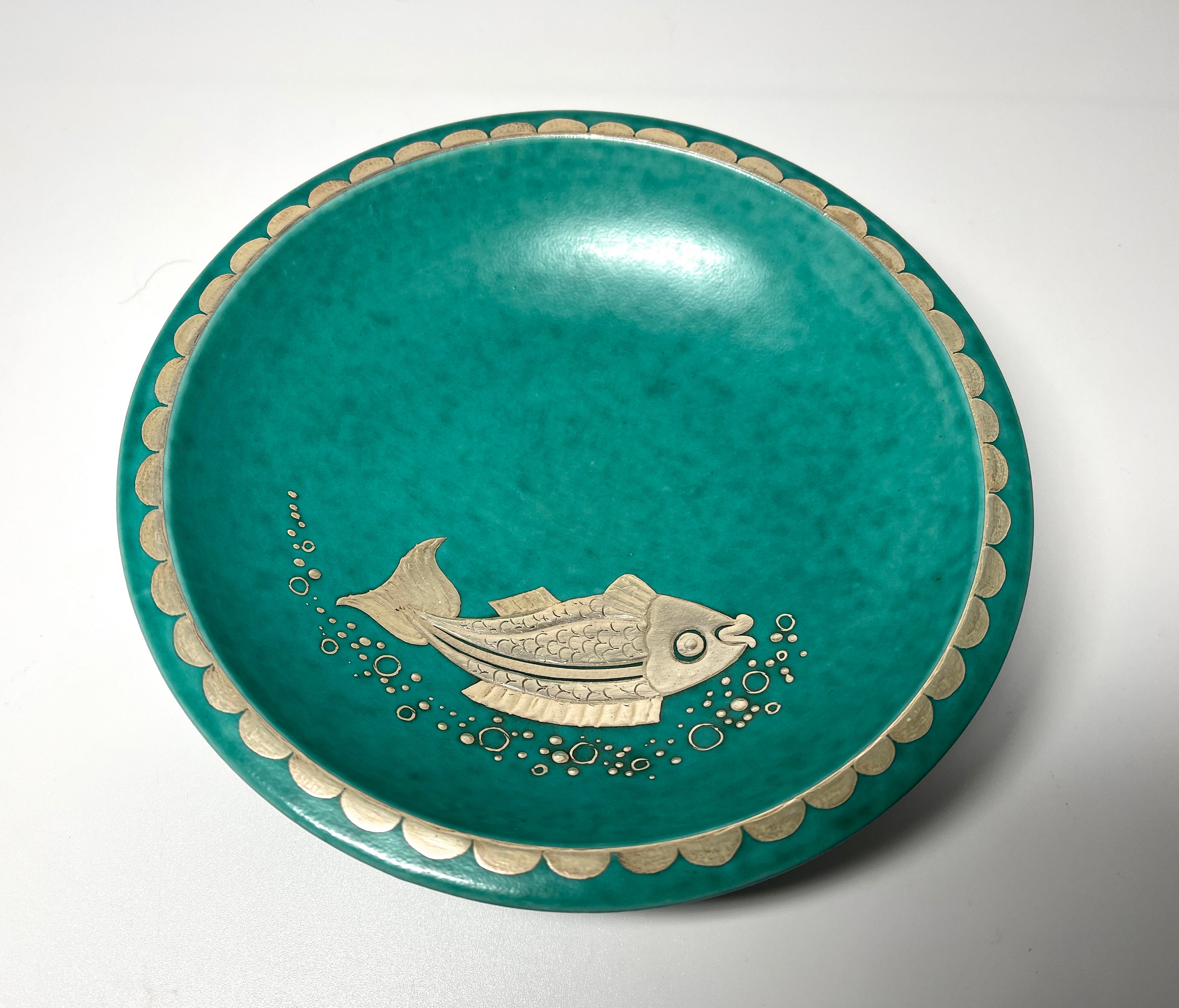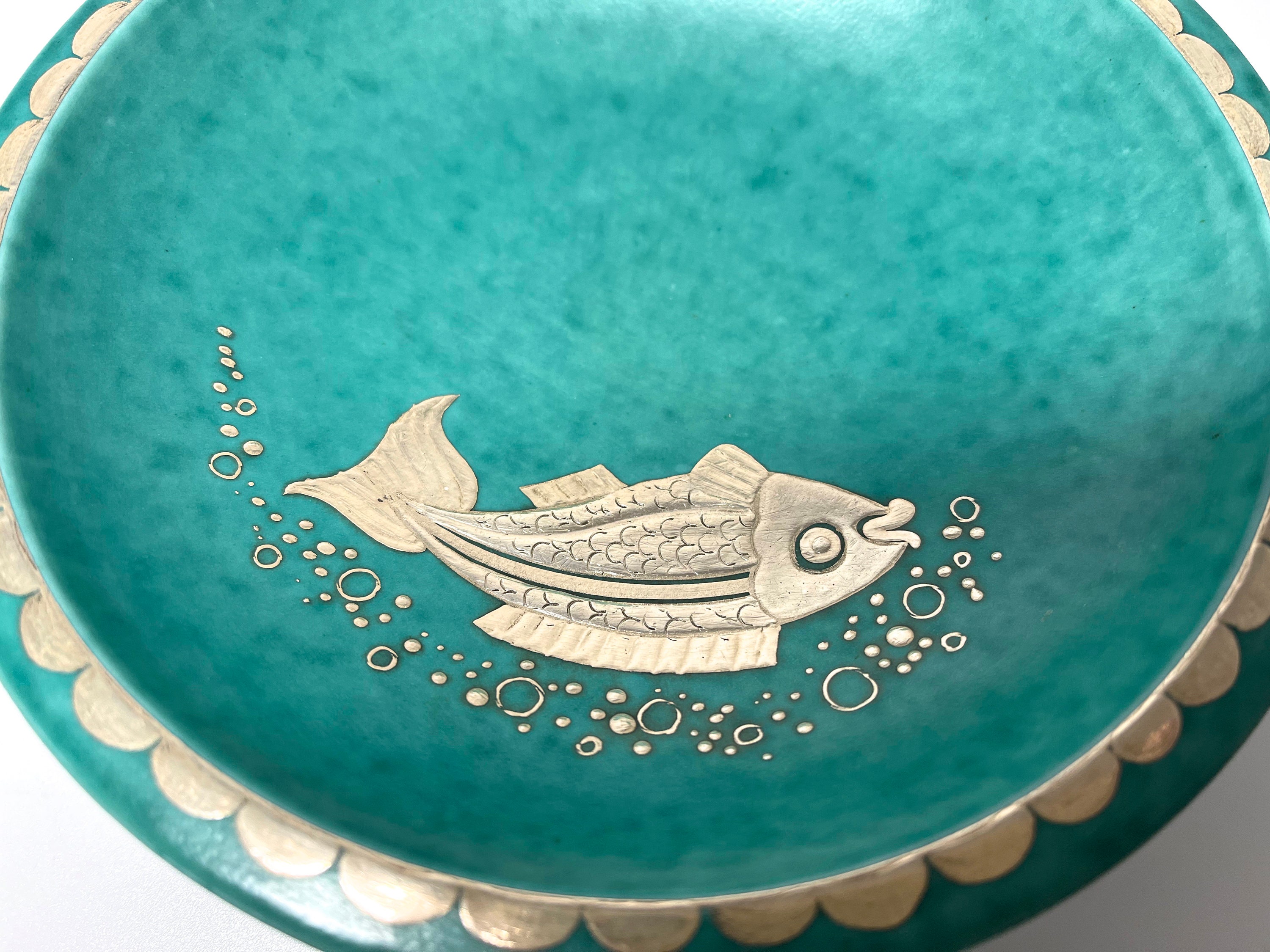 An expressive silver fish adorns this elegant footed dish by Wilhelm Kage for Gustavsberg, Sweden. Superbly decorated with an amusing stylised fish and banding to rim and foot in applied silver