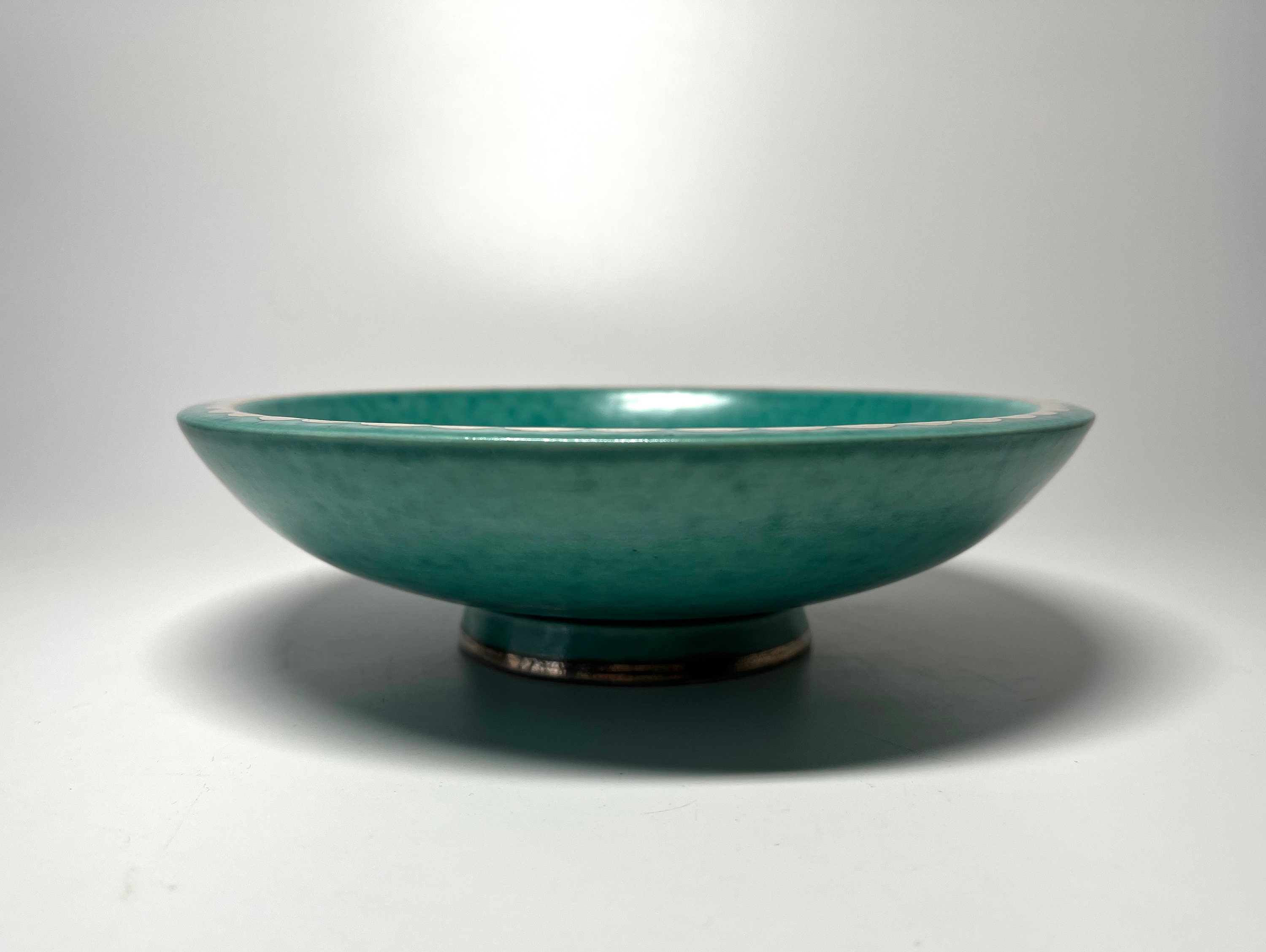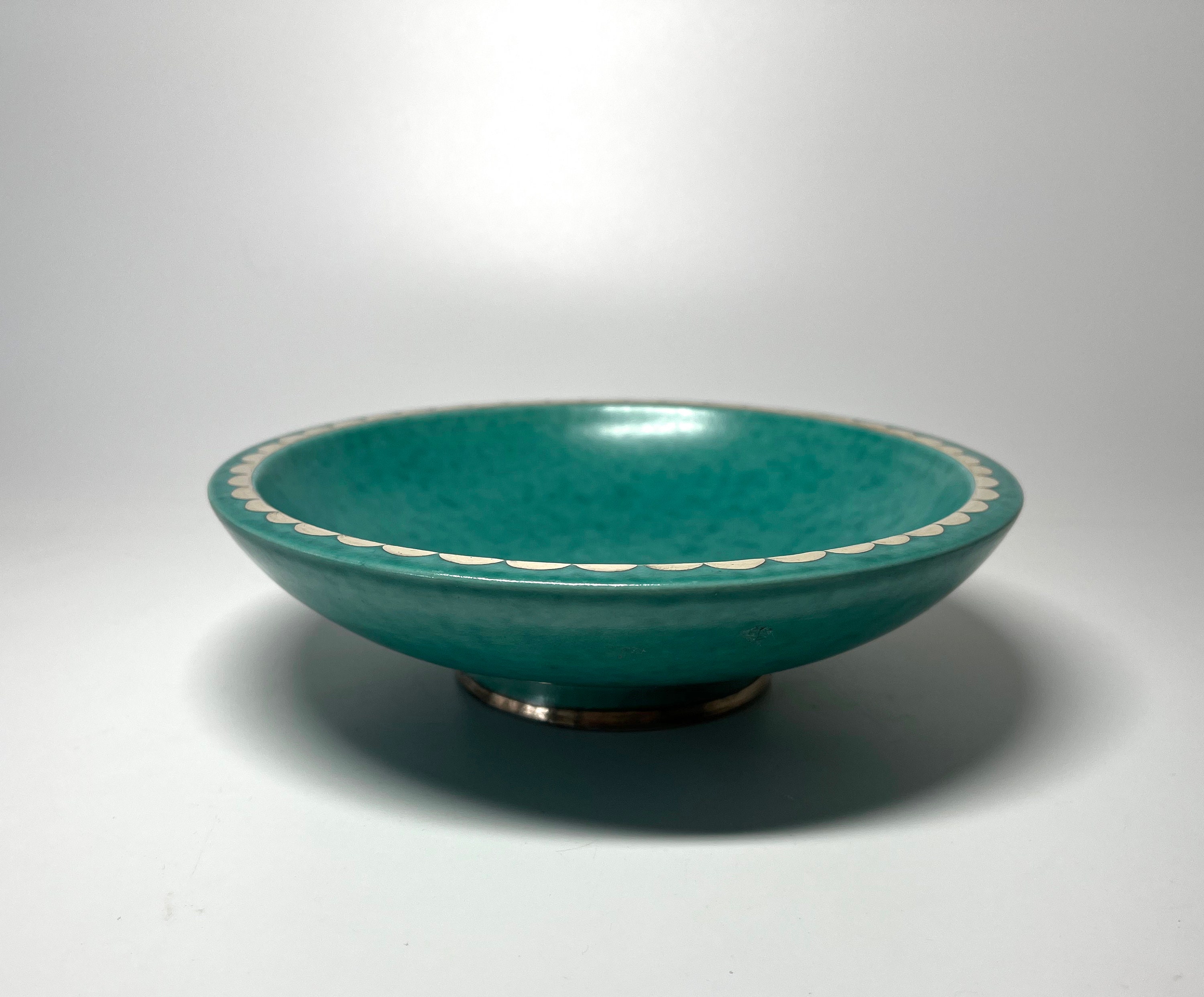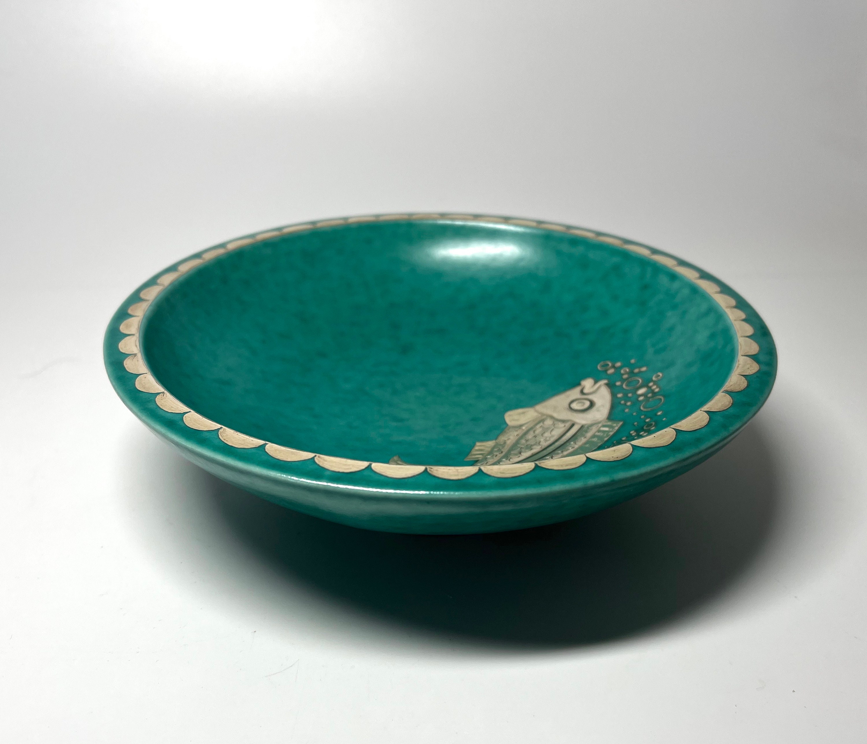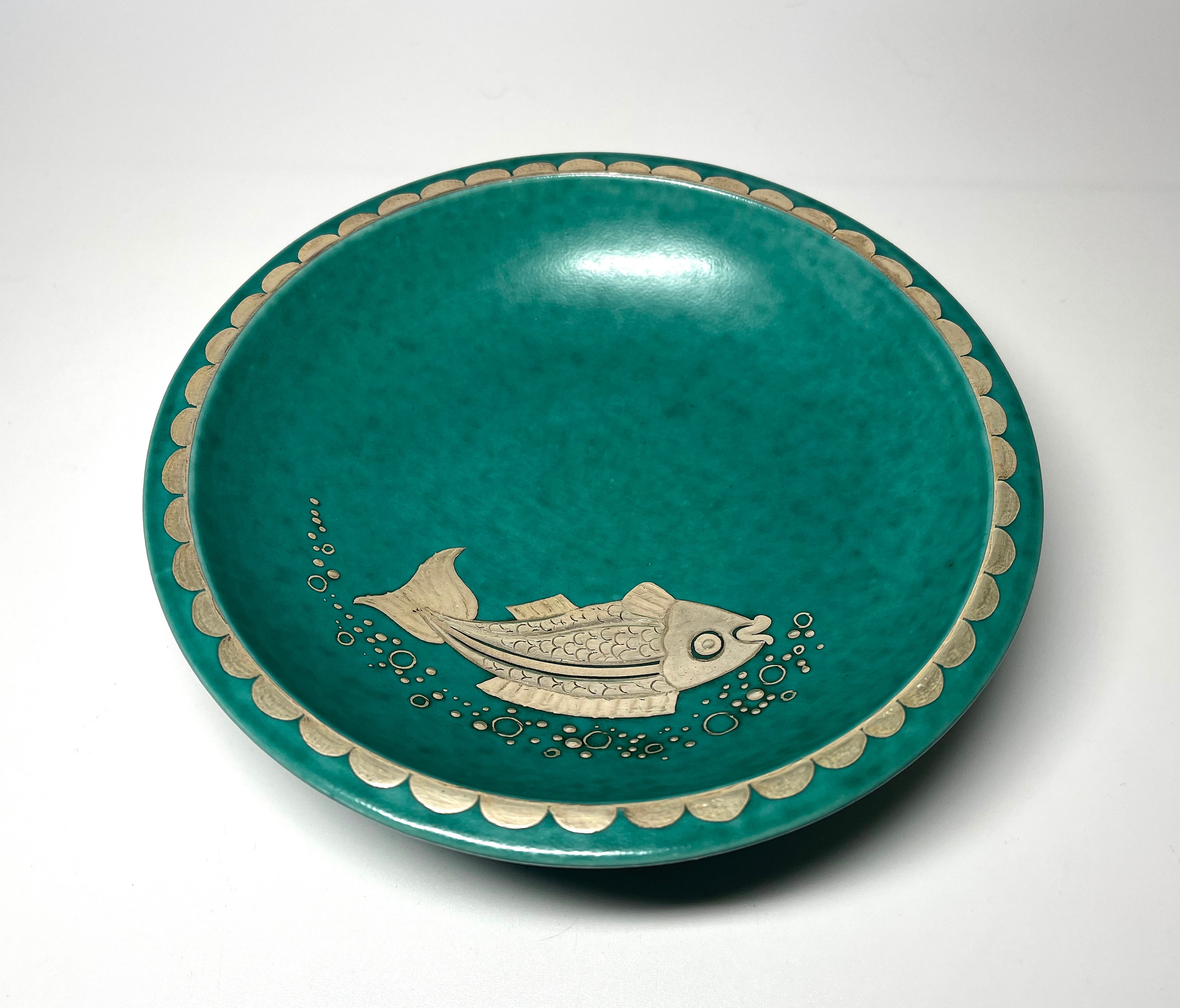 An expressive silver fish adorns this elegant footed dish by Wilhelm Kage for Gustavsberg, Sweden. Superbly decorated with an amusing stylised fish and banding to rim and foot in applied silver