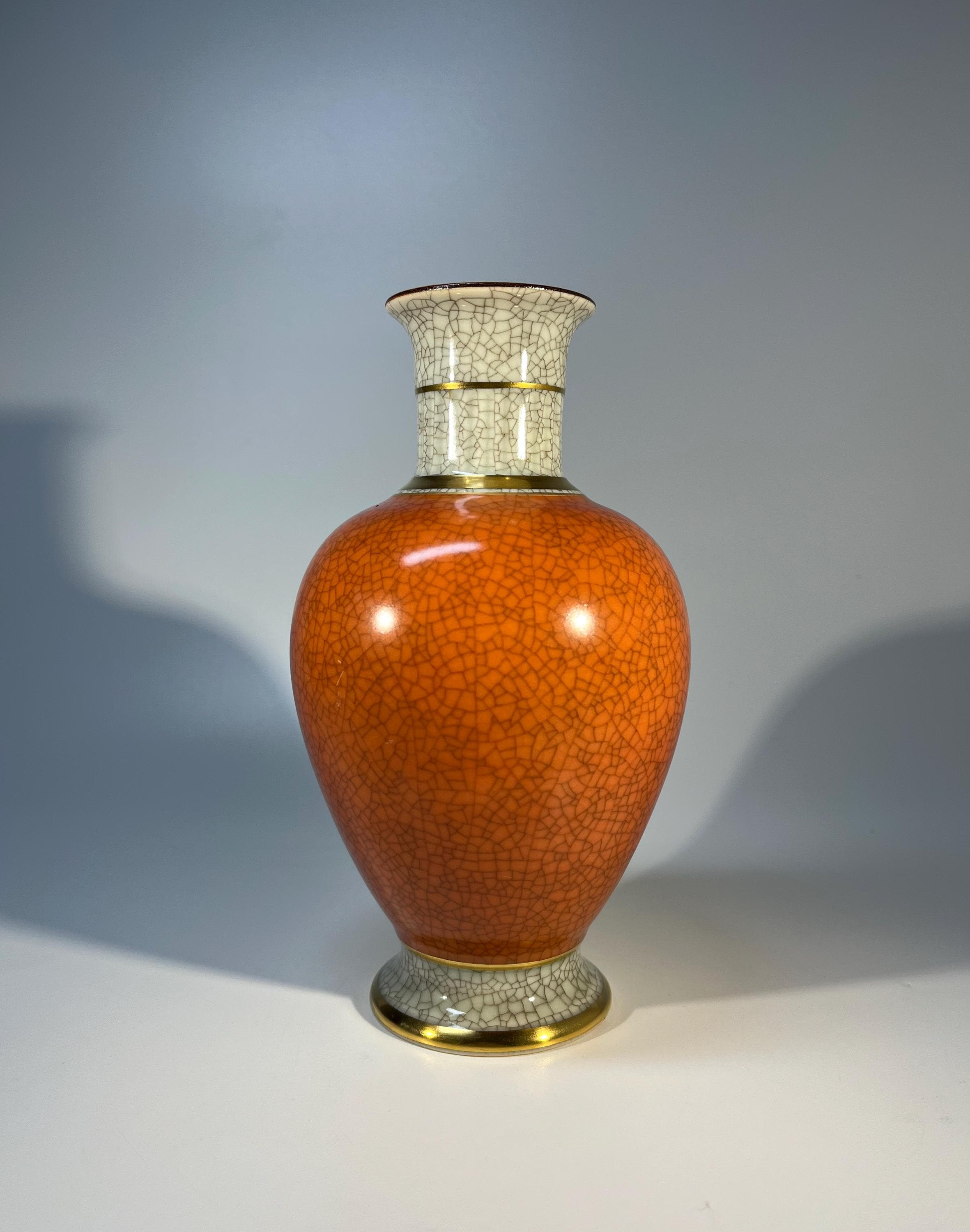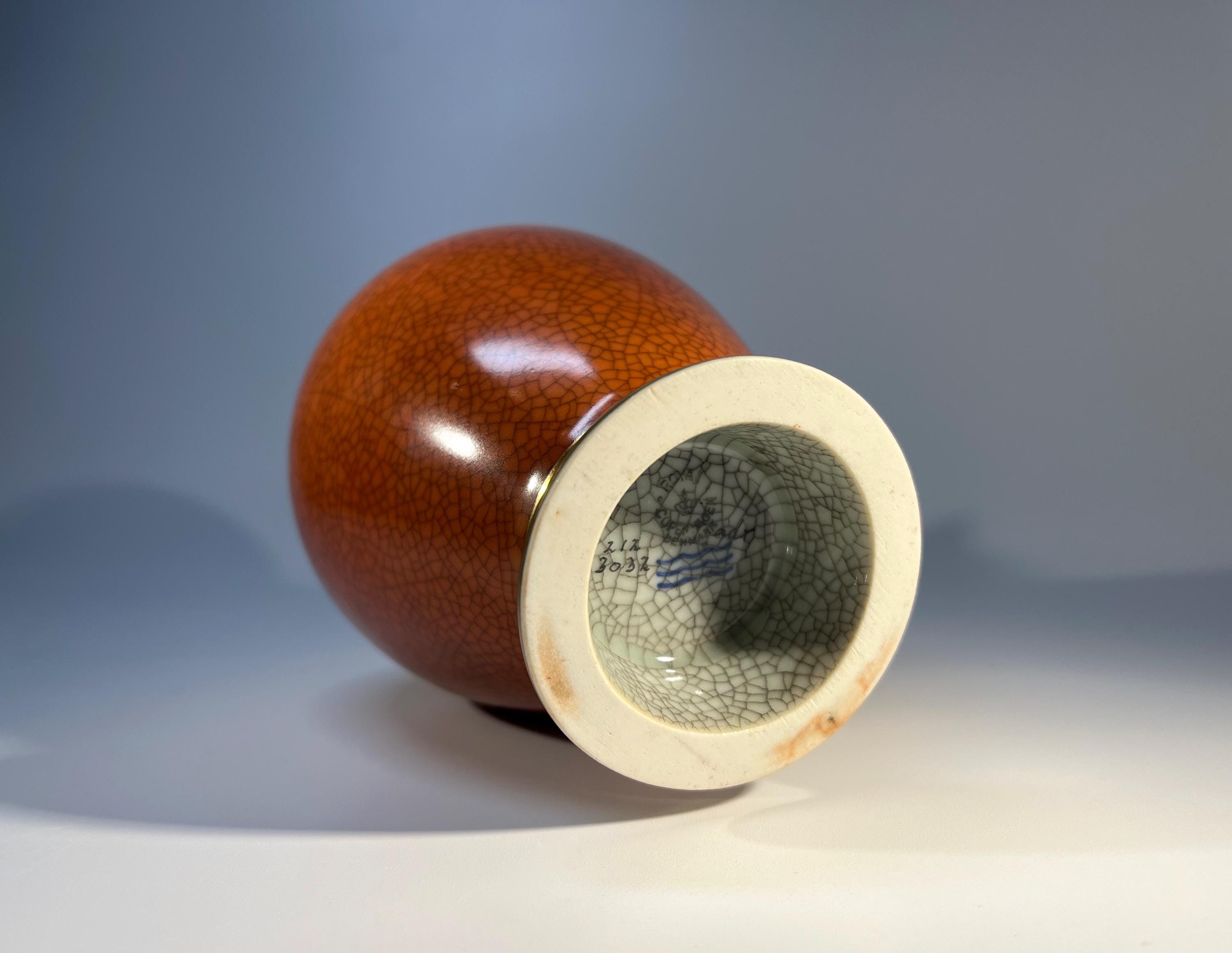 Elegant terracotta orange and grey porcelain, Royal Copenhagen crackle glazed vase with gilded banding on neck and base.