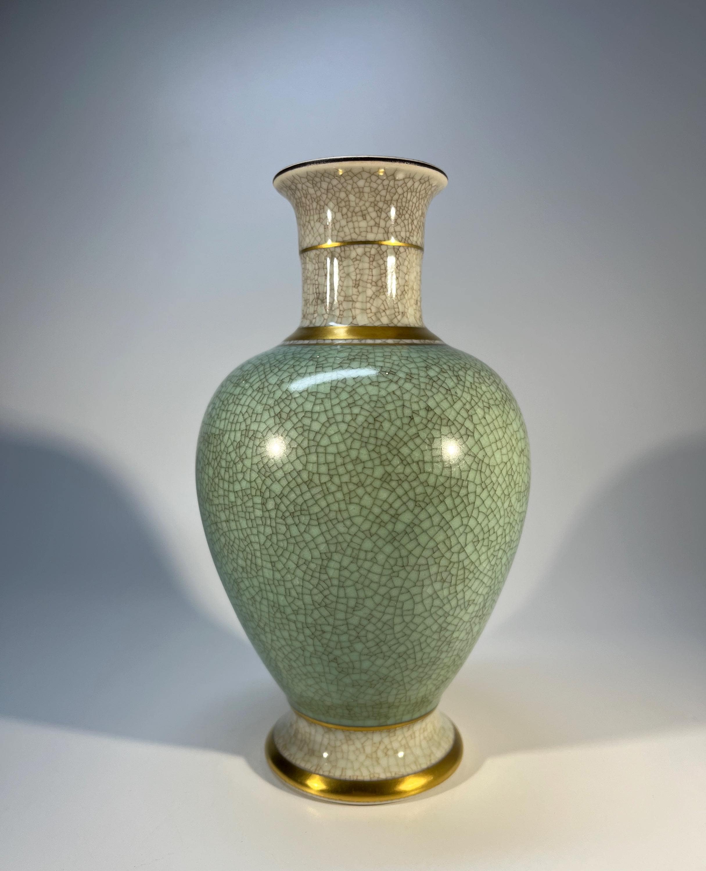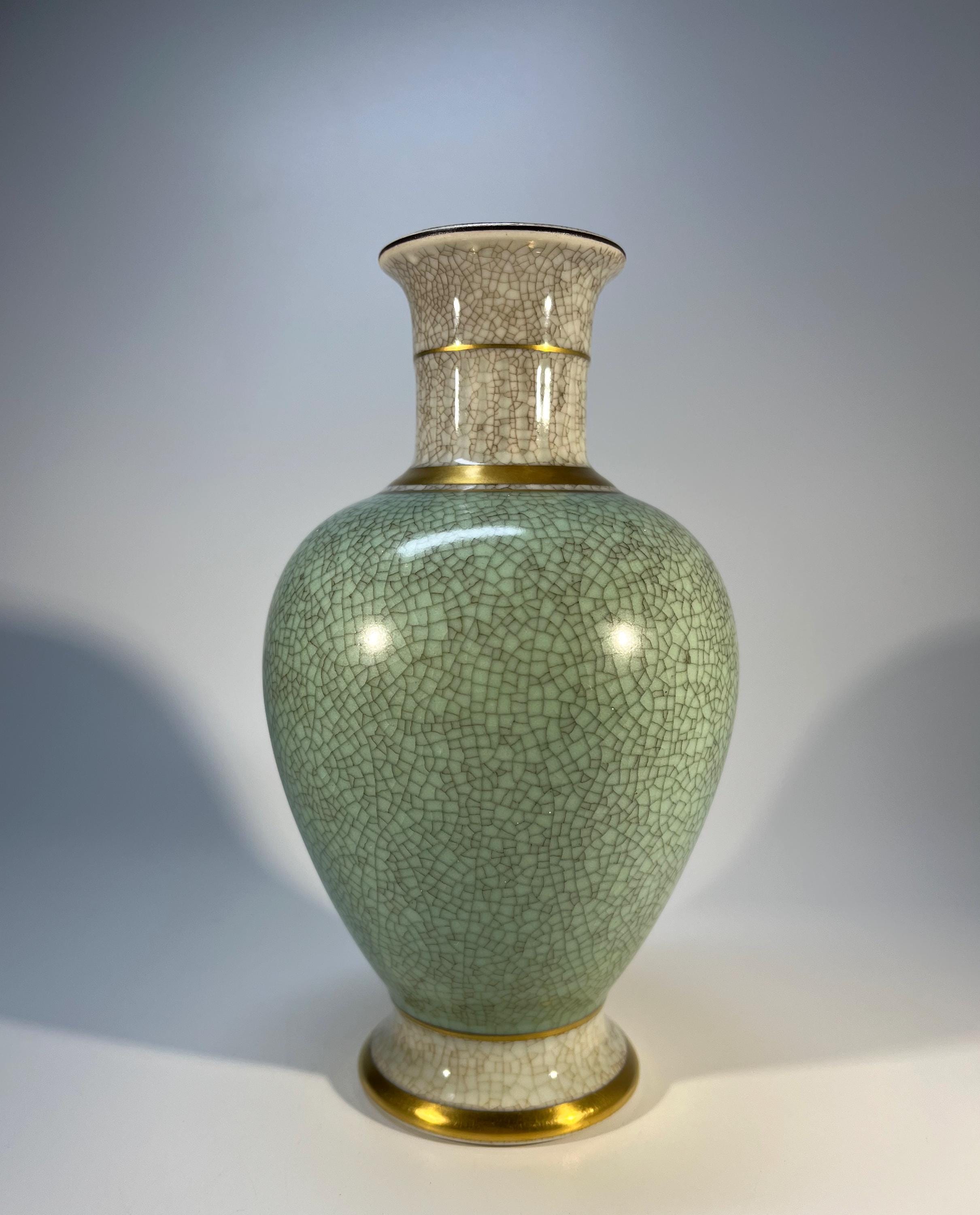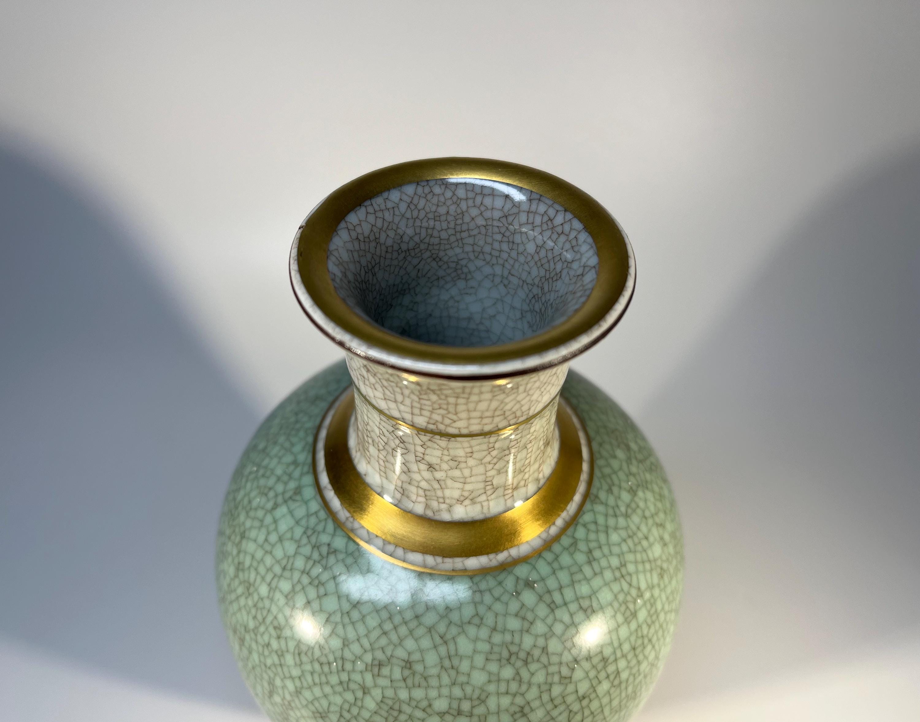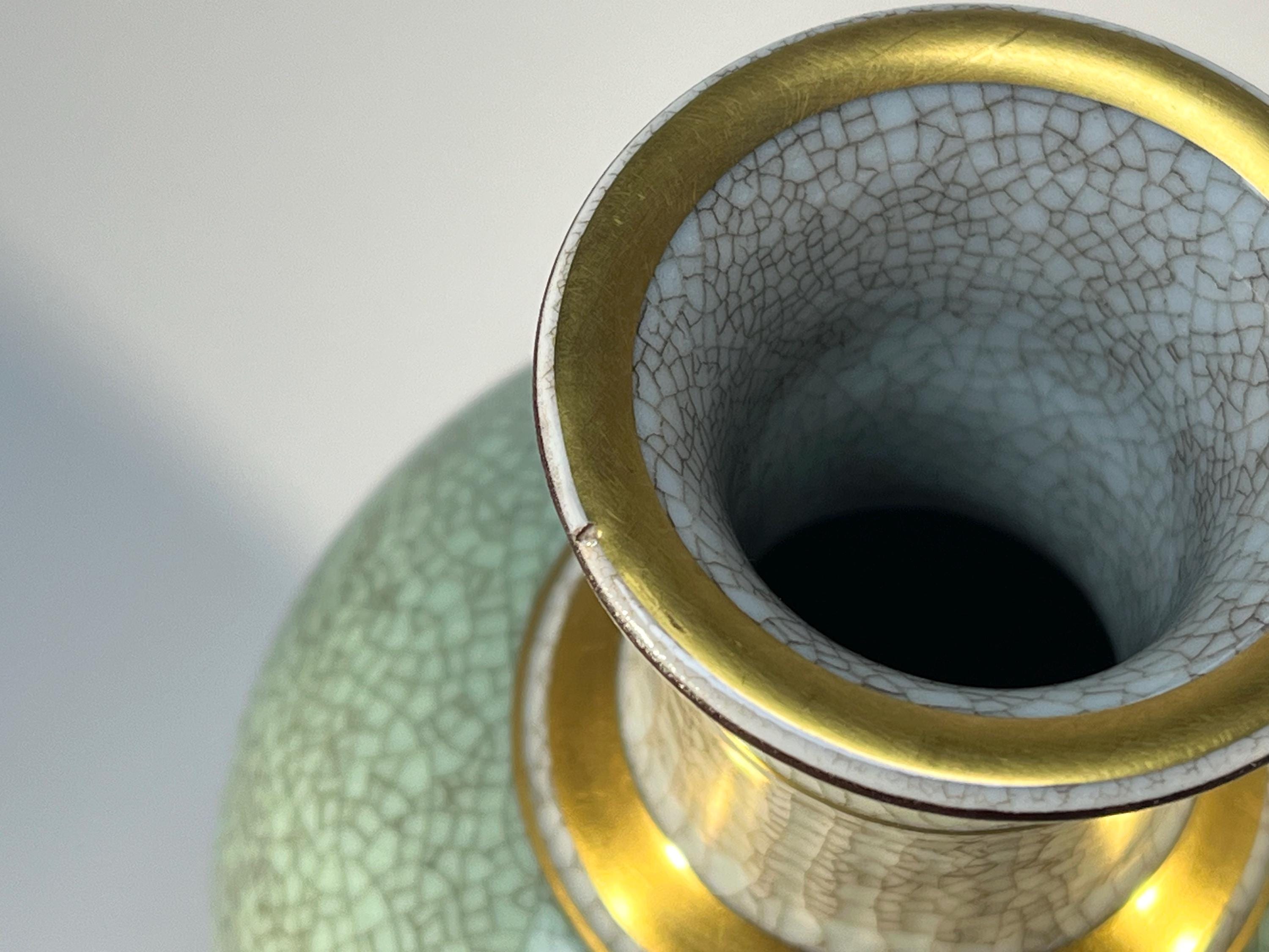 Elegant pale green and grey porcelain, Royal Copenhagen crackle glazed vase with gilded banding on neck and base.