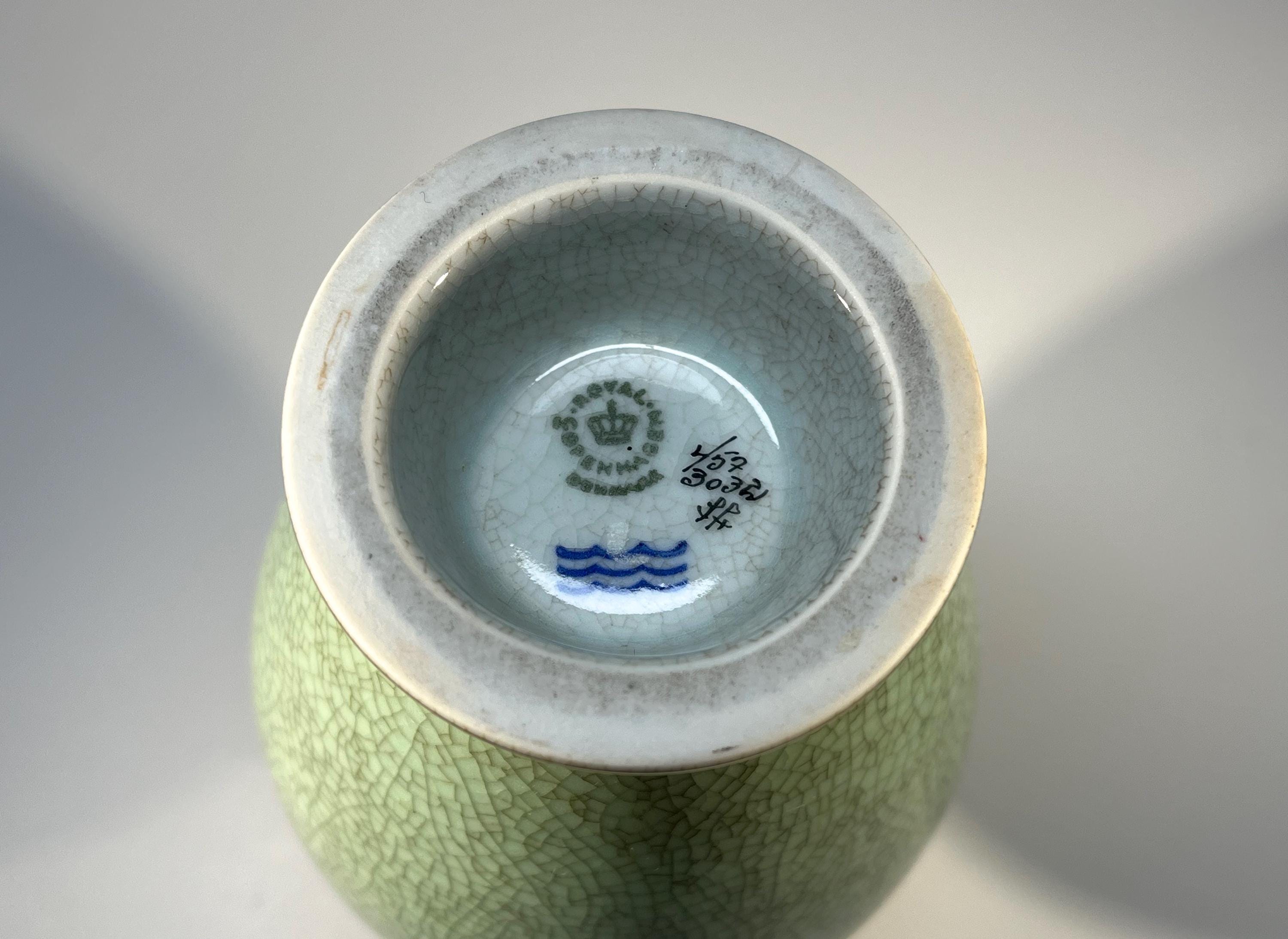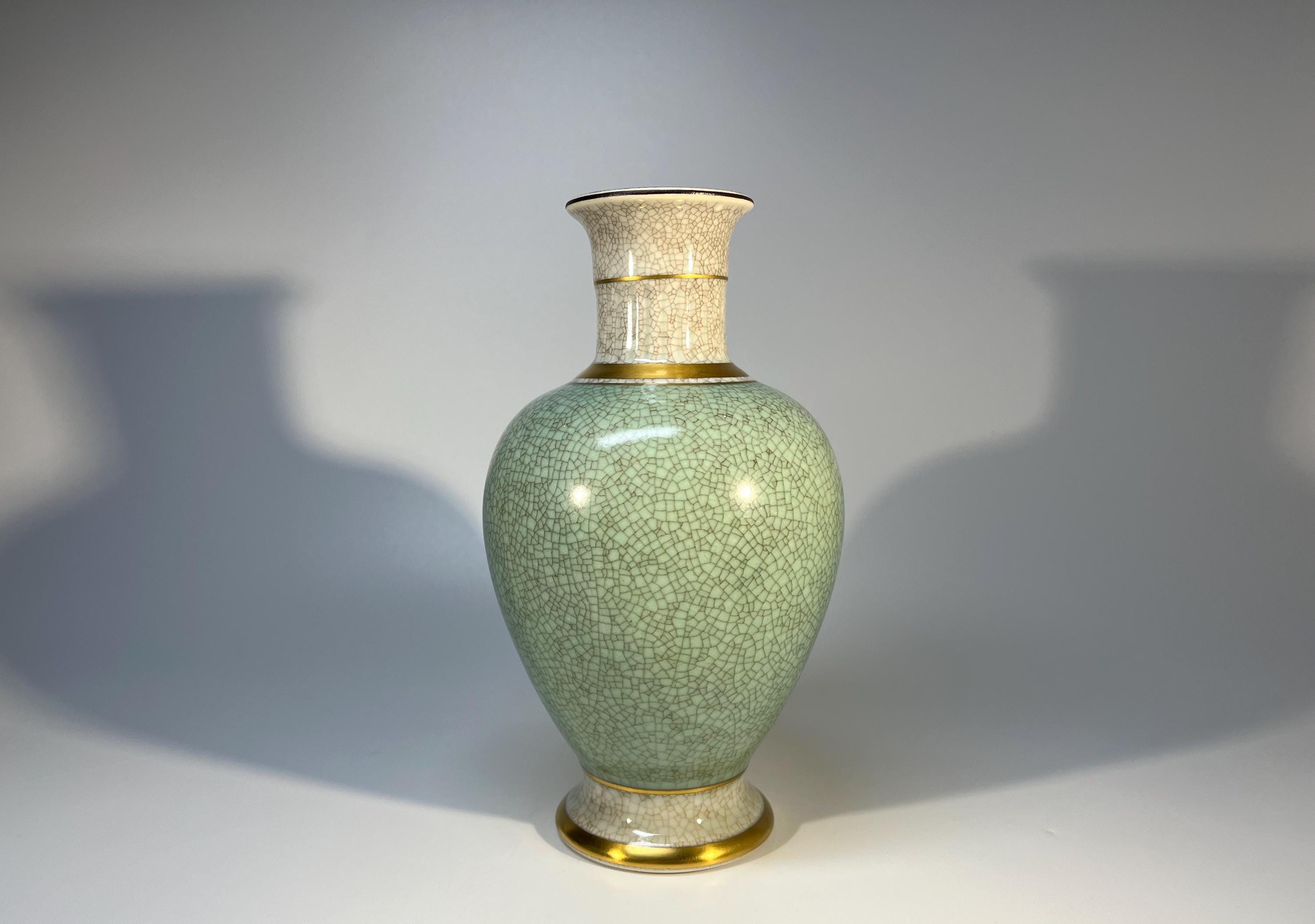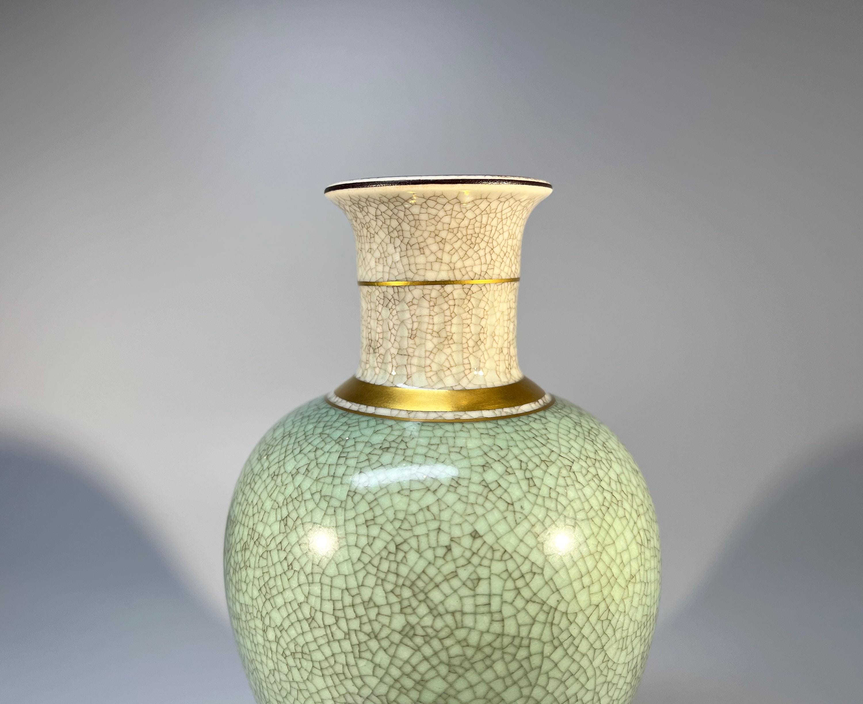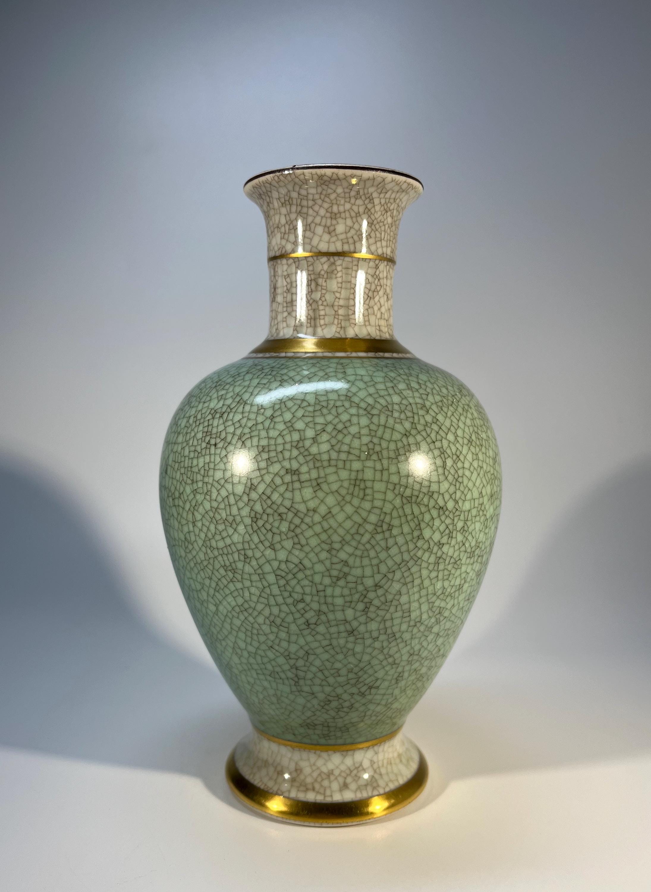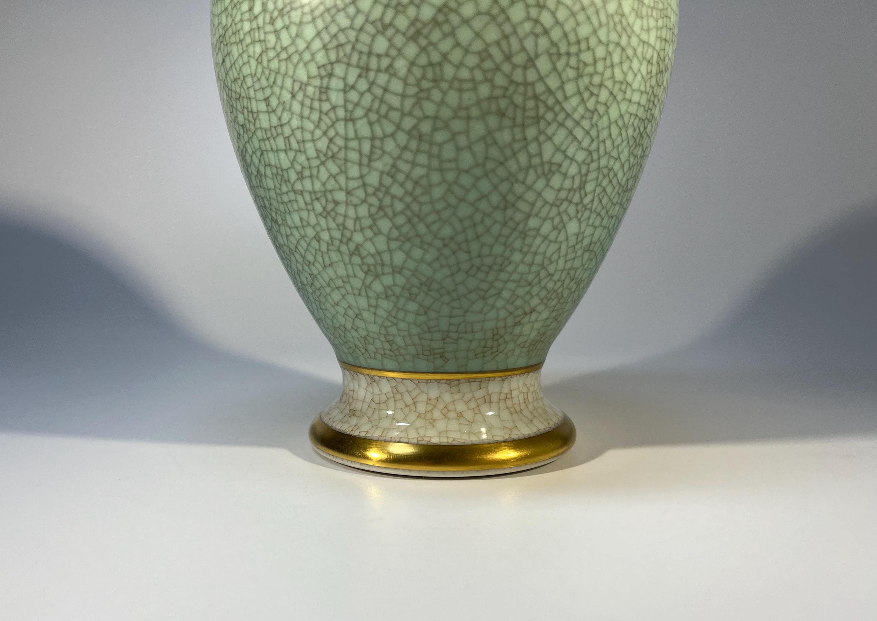 Elegant pale green and grey porcelain, Royal Copenhagen crackle glazed vase with gilded banding on neck and base.