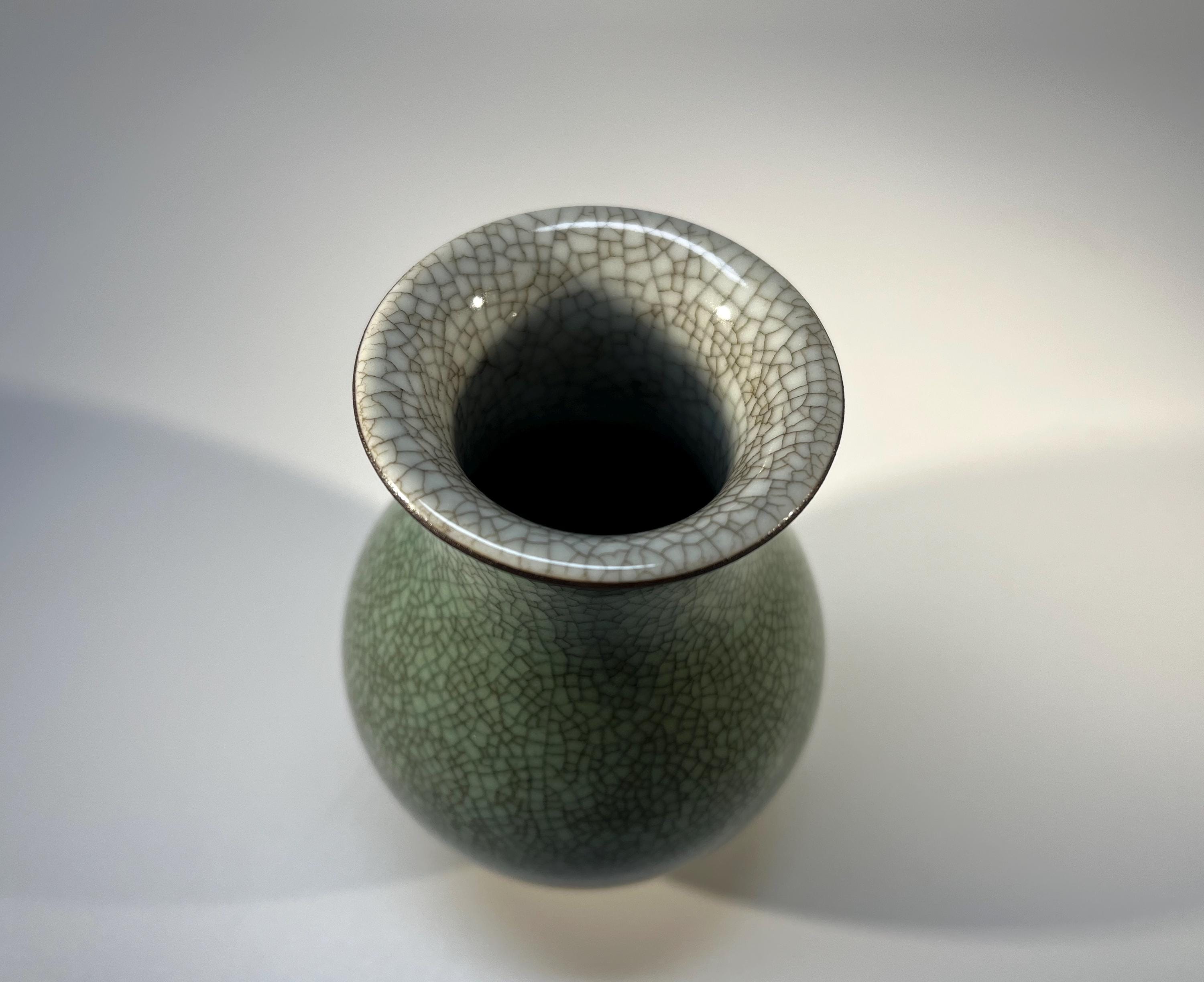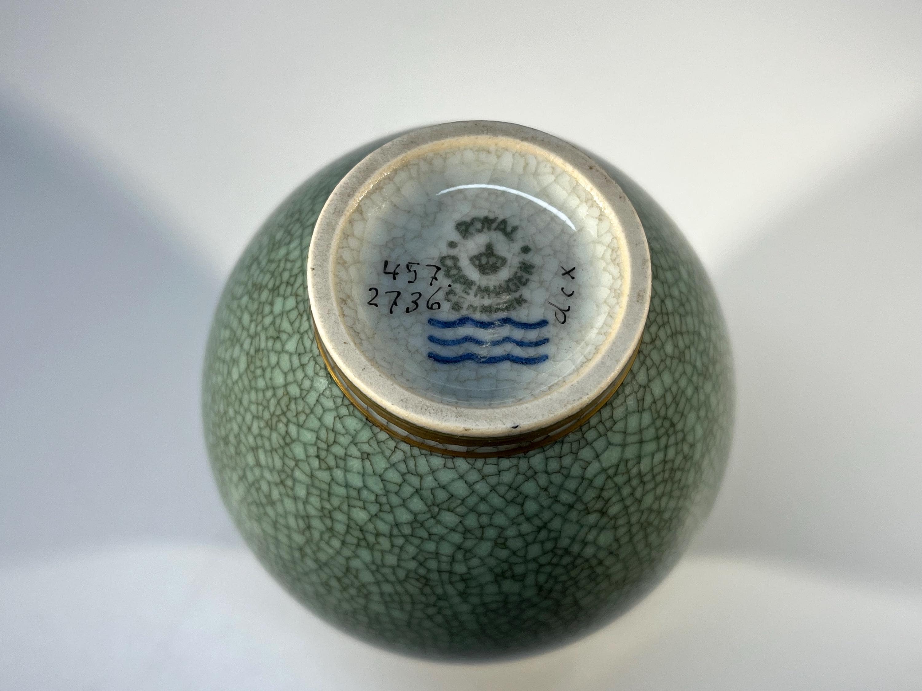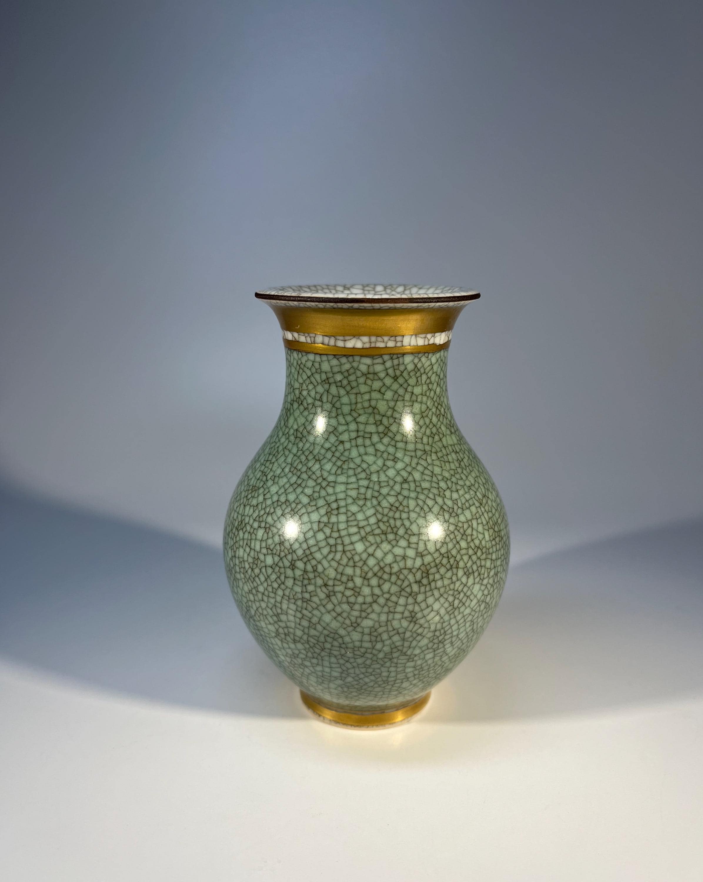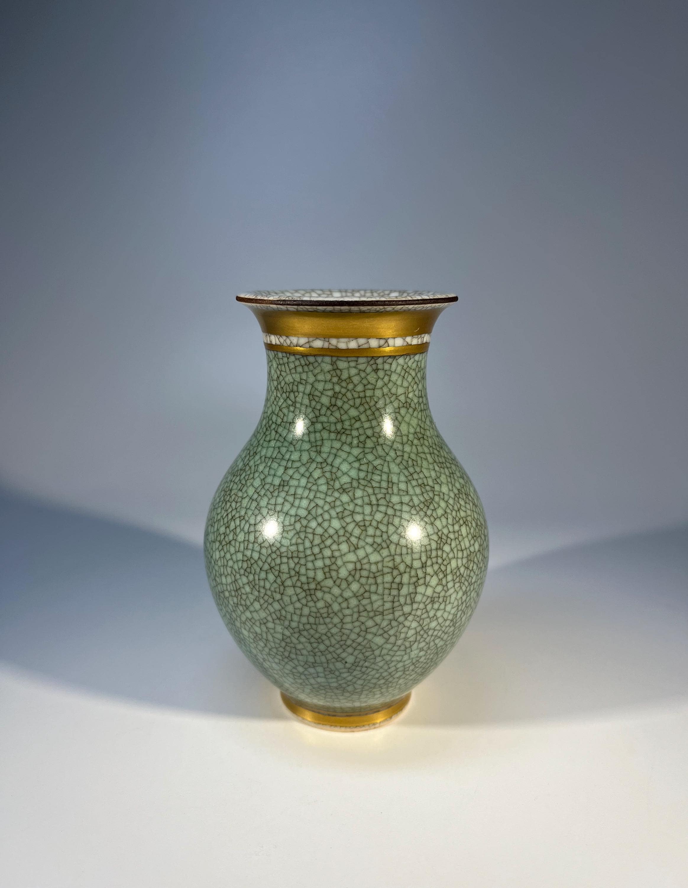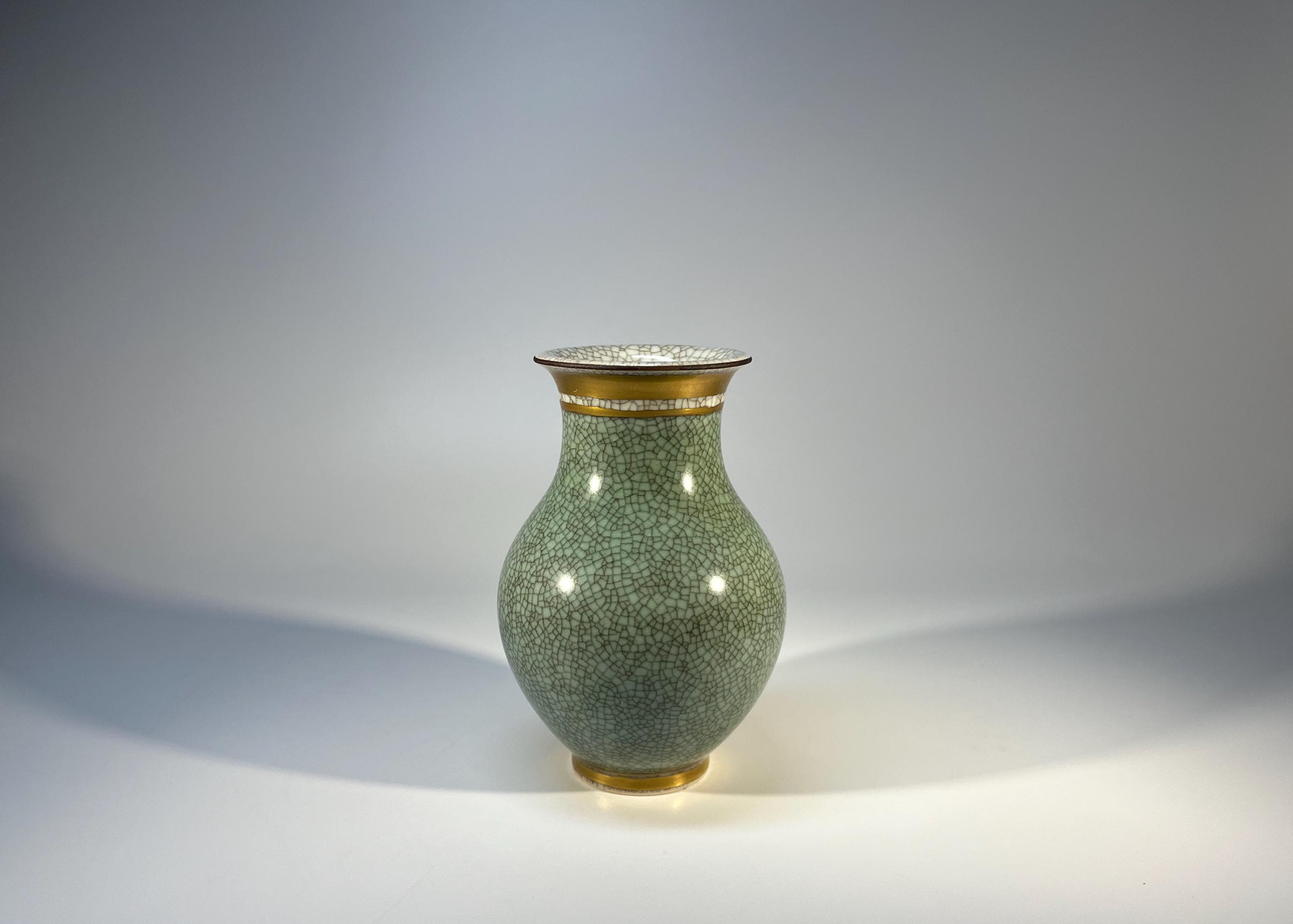 Royal Copenhagen porcelain gilded pale green and grey crackle glazed petit baluster vase