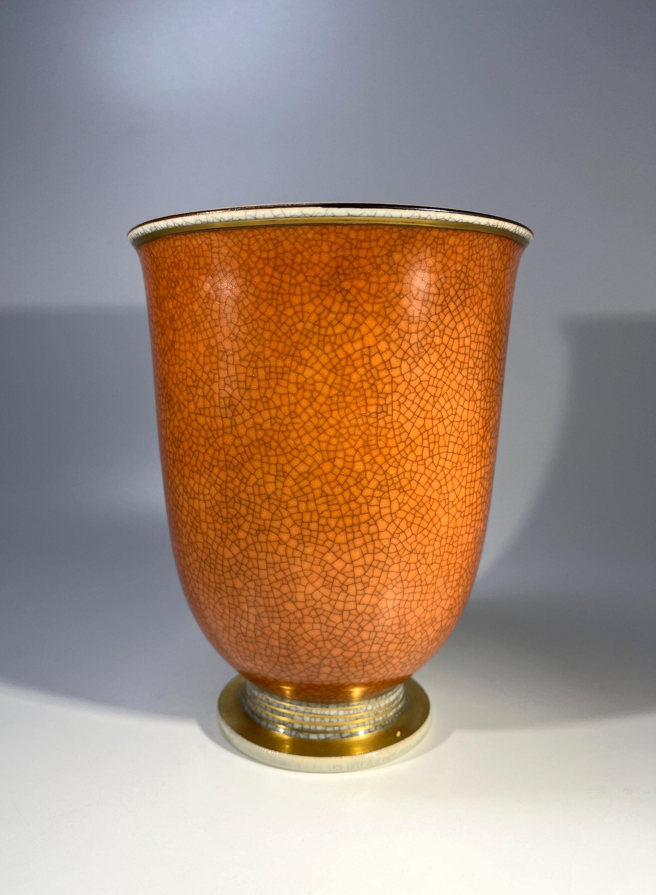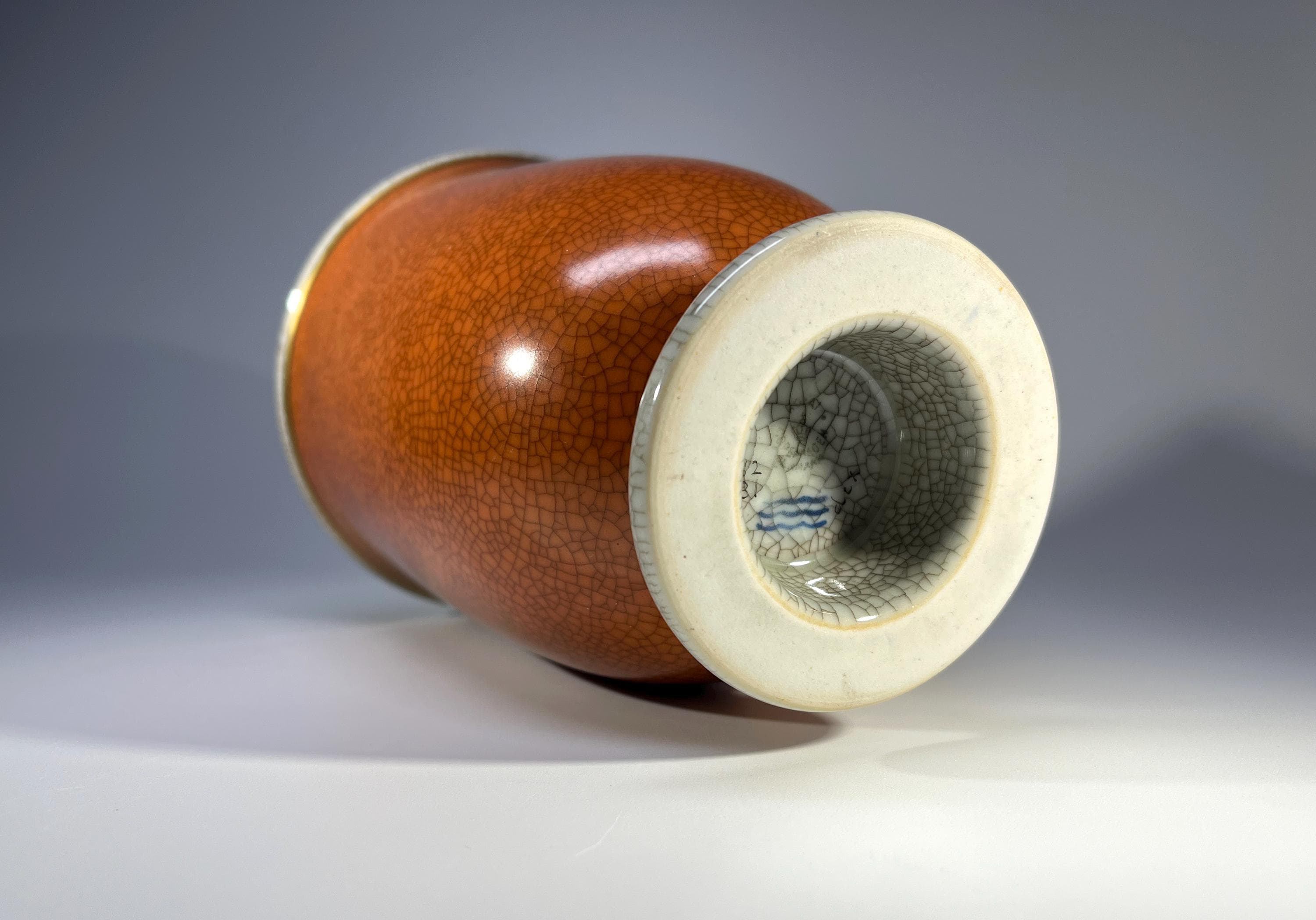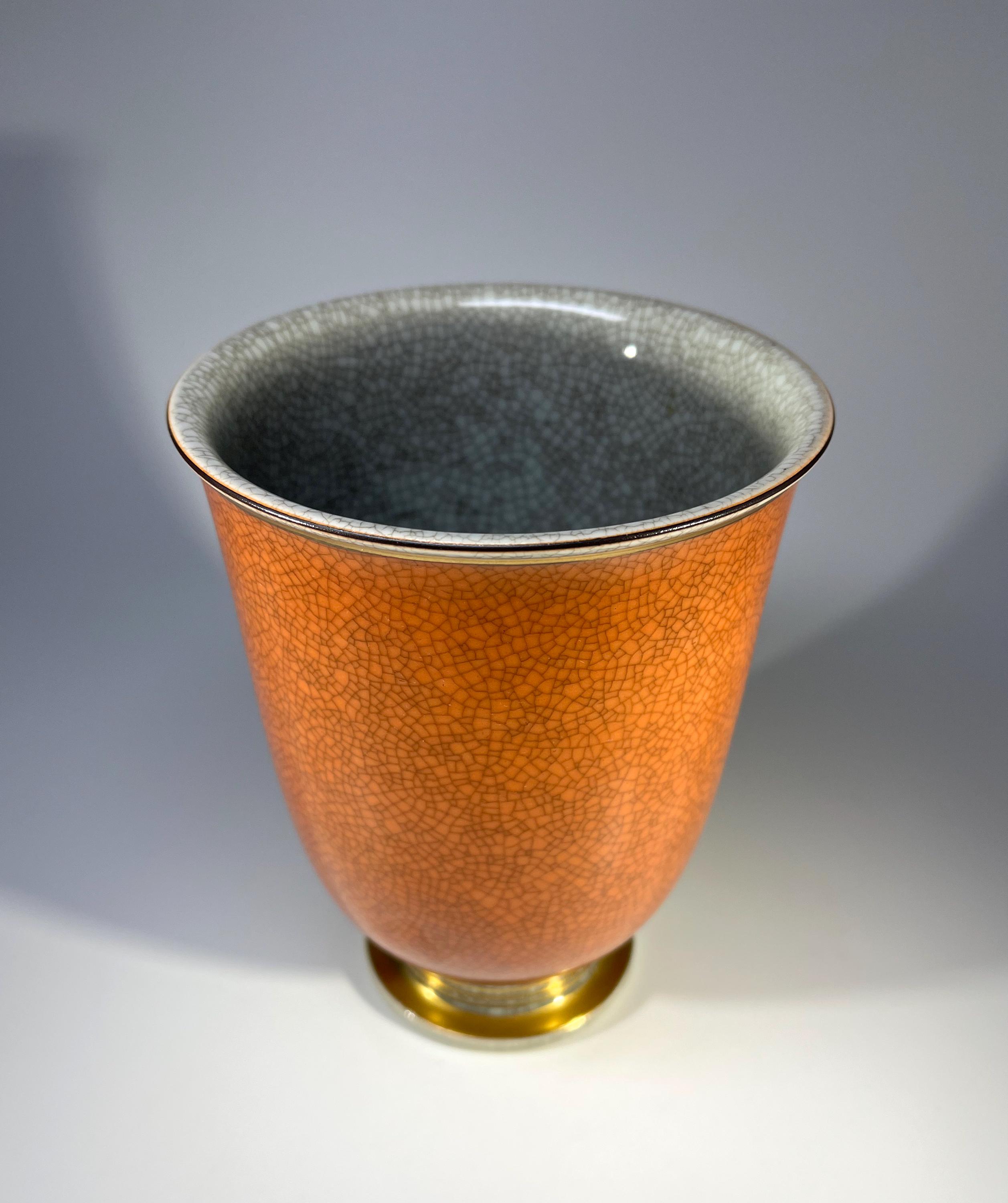 Graceful Royal Copenhagen porcelain terracotta and grey crackle glazed vase with gilded banding on base by Thorkild Olsen.