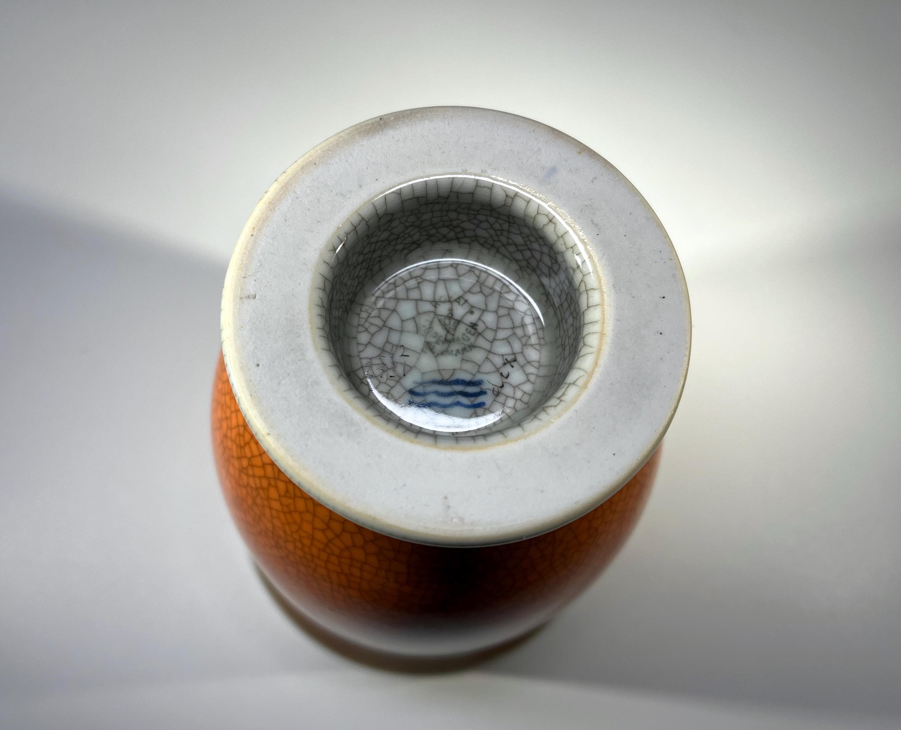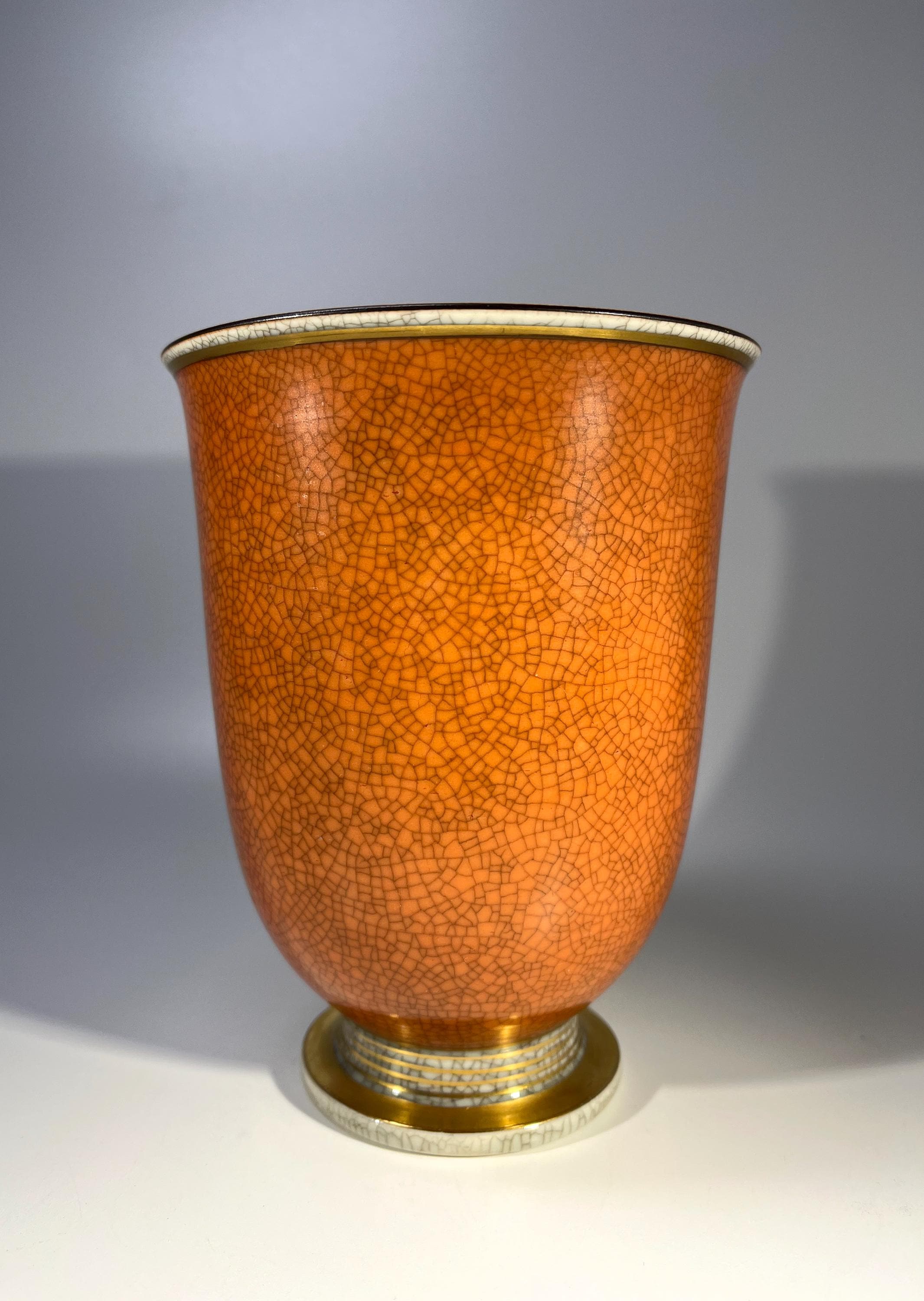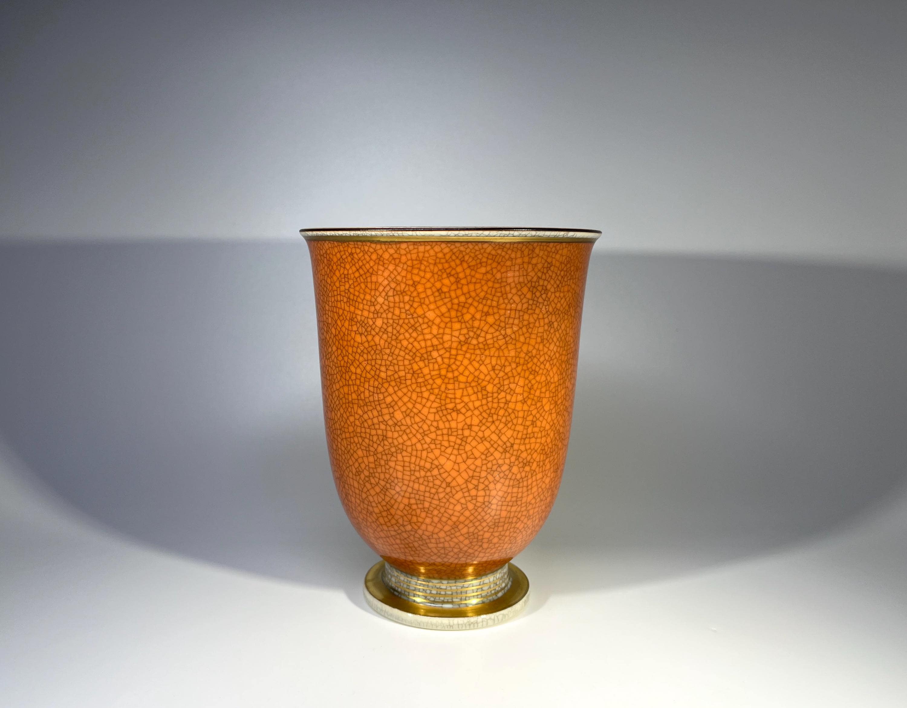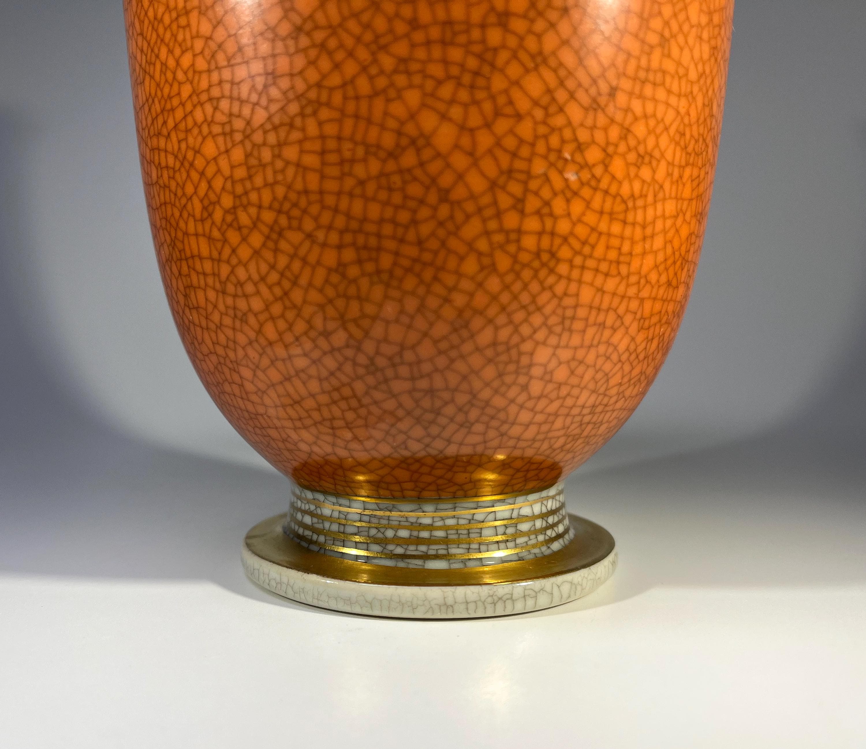 Graceful Royal Copenhagen porcelain terracotta and grey crackle glazed vase with gilded banding on base by Thorkild Olsen.
